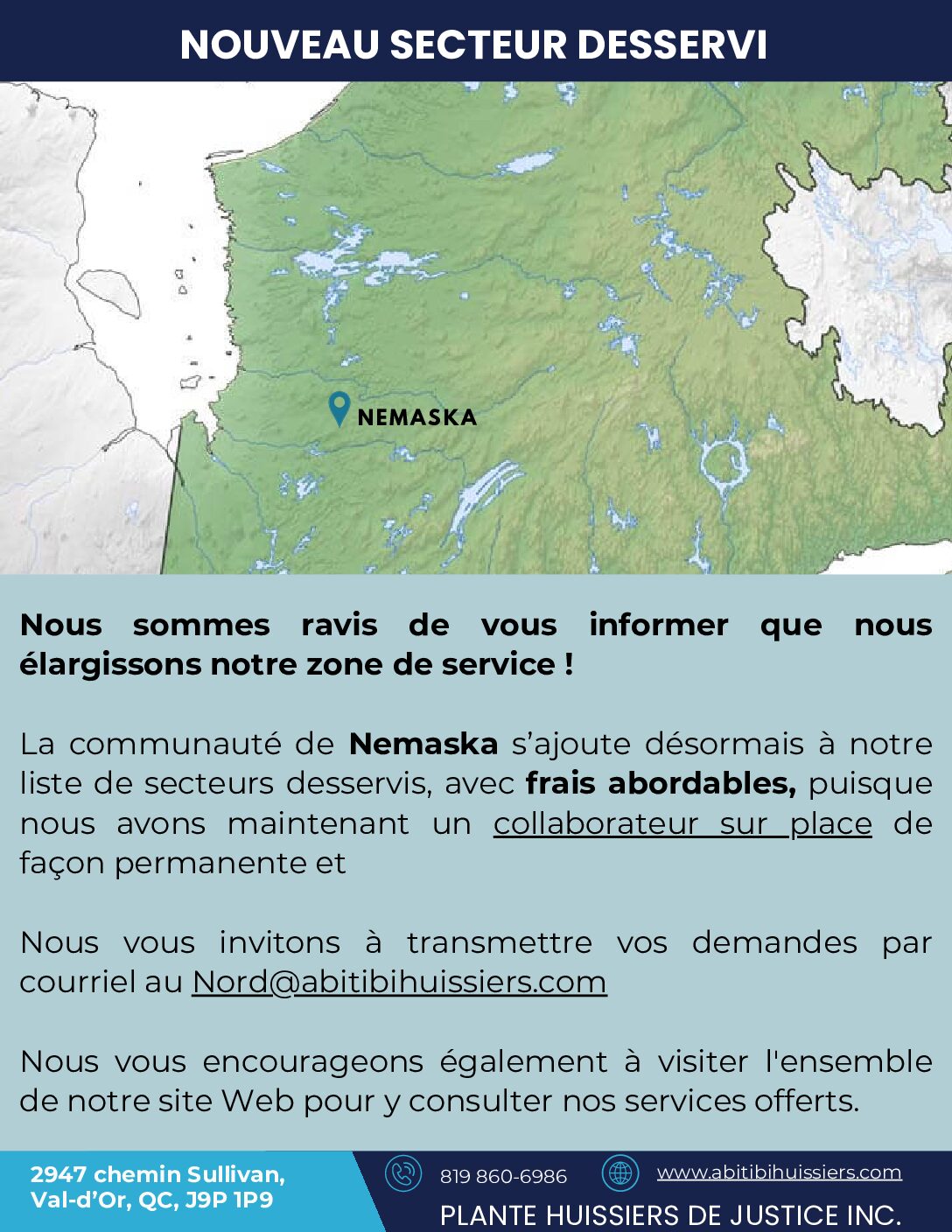 Notre équipe est à votre disposition pour vous guider, répondre à toutes vos questions et trouver des solutions adaptées à vos besoins. Pour découvrir l’ensemble de nos services et des secteurs que nous desservons, visitez notre site web : www.abitibihuissiers.com ou contactez-nous directement par courriel à nord@abitibihuissiers.com